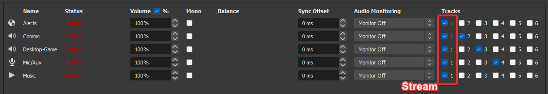 In this example, I'm going to leave all my source enabled on "Track 1", because that is the default for the stream, and I want it to contain all sources.