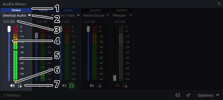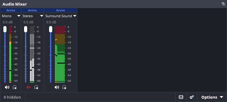 Note: OBS Studio defaults to Stereo audio. This can be configured in the Audio section of the application Settings. You will only see volume meters up to the number of channels configured.
