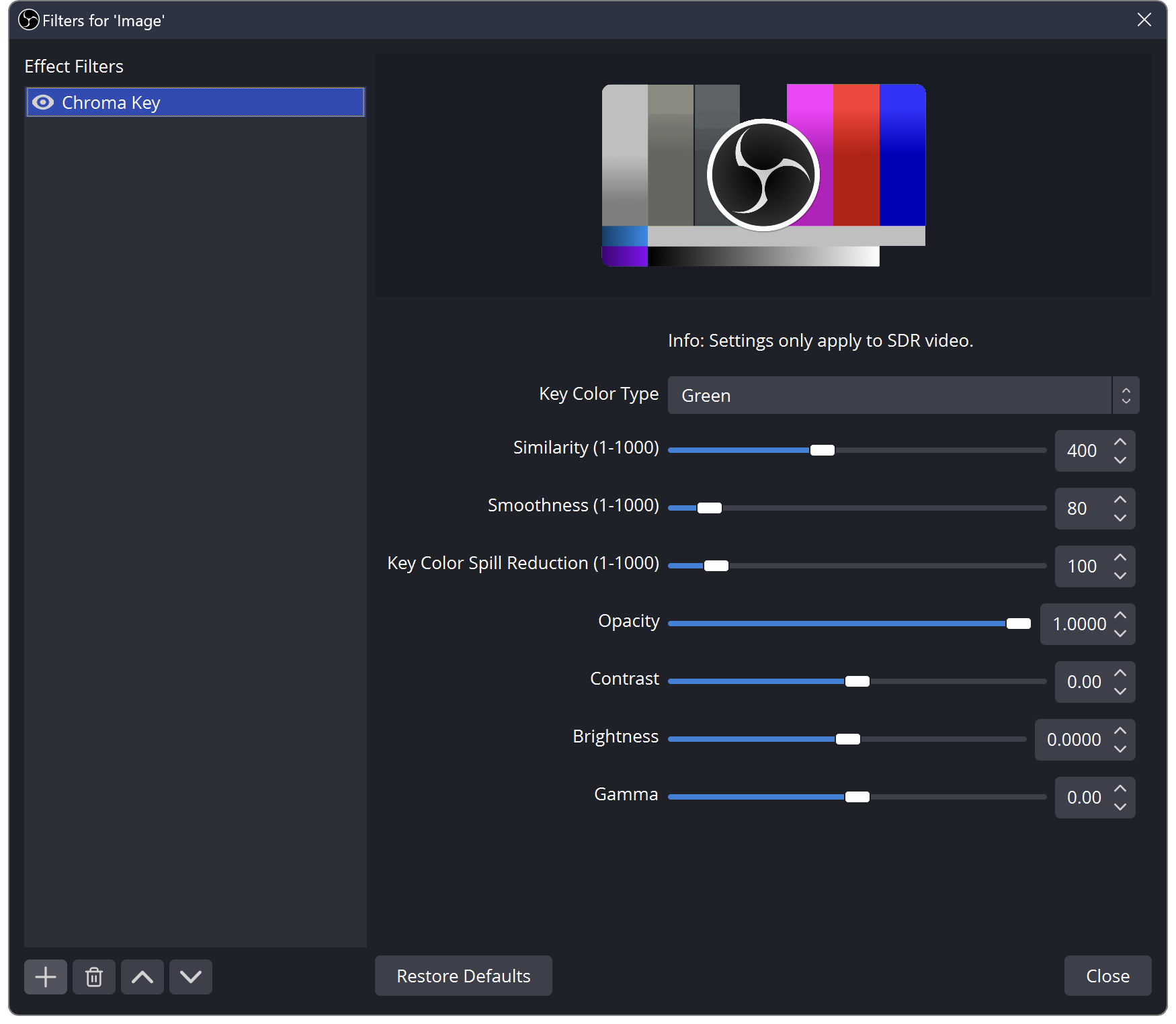 Removes any instances of a given color from the Source. This can be controlled so as not to remove too much. Use this filter for green screens.