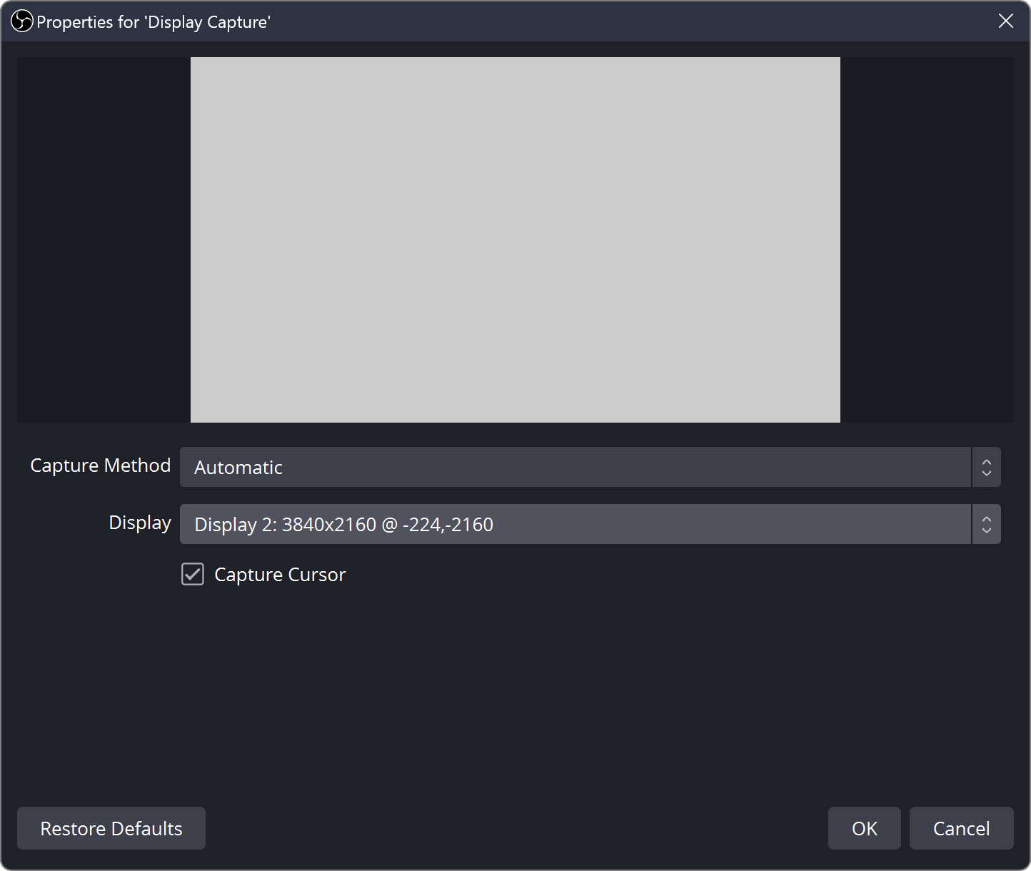 Sets the area of the display to crop. This option can automatically crop to the bounds of a window; however, unlike Window Capture, any windows that overlap the area will still be captured