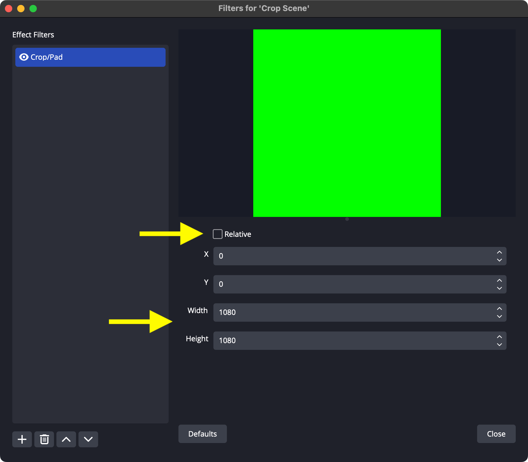 2. Add a Crop/Pad filter to the scene. Uncheck Relative, then specify the size you wish the scene to be under Width and Height. In this case, I want the crop scene to be square (1080 by 1080). |