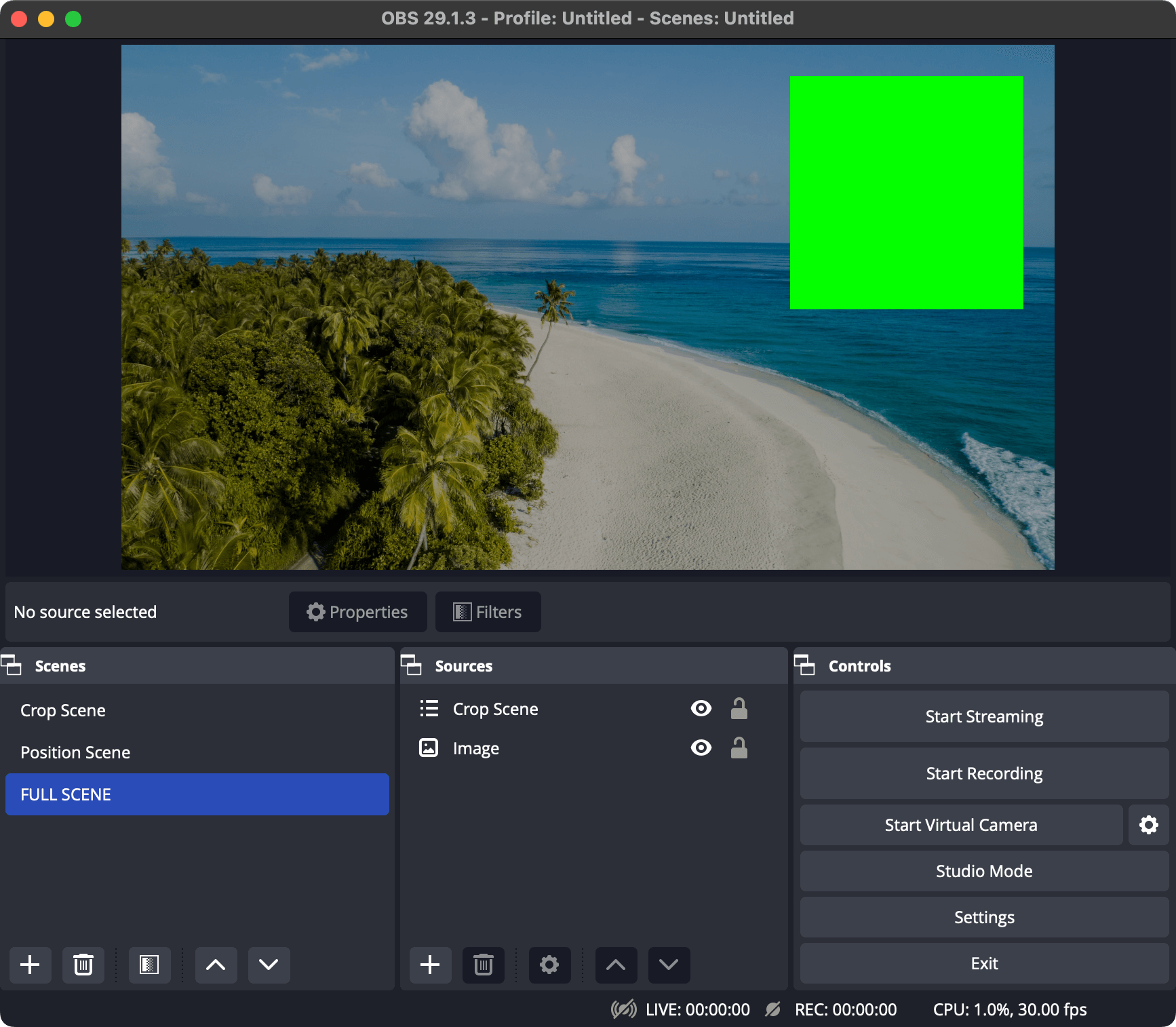 1. Create a scene (we will call it the crop scene). The crop scene is the one that will be shown on other scenes. In the Scenes dock, click on the Filters button. |