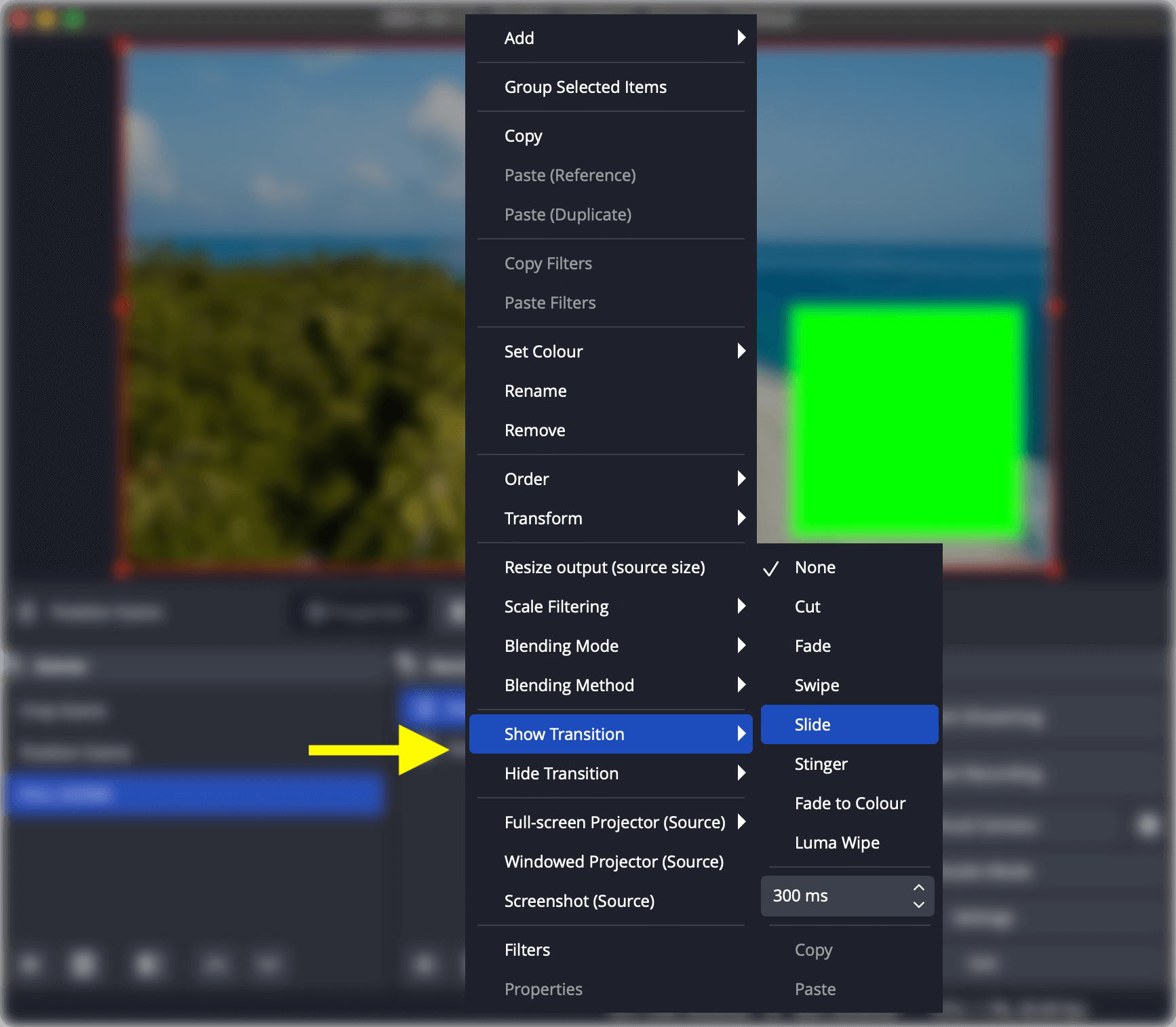 4. Right-click on the position scene source, then set up the Show Transition and Hide Transition. This will be used to smoothly animate the contents of the crop scene when the position scene source is shown/hidden. |