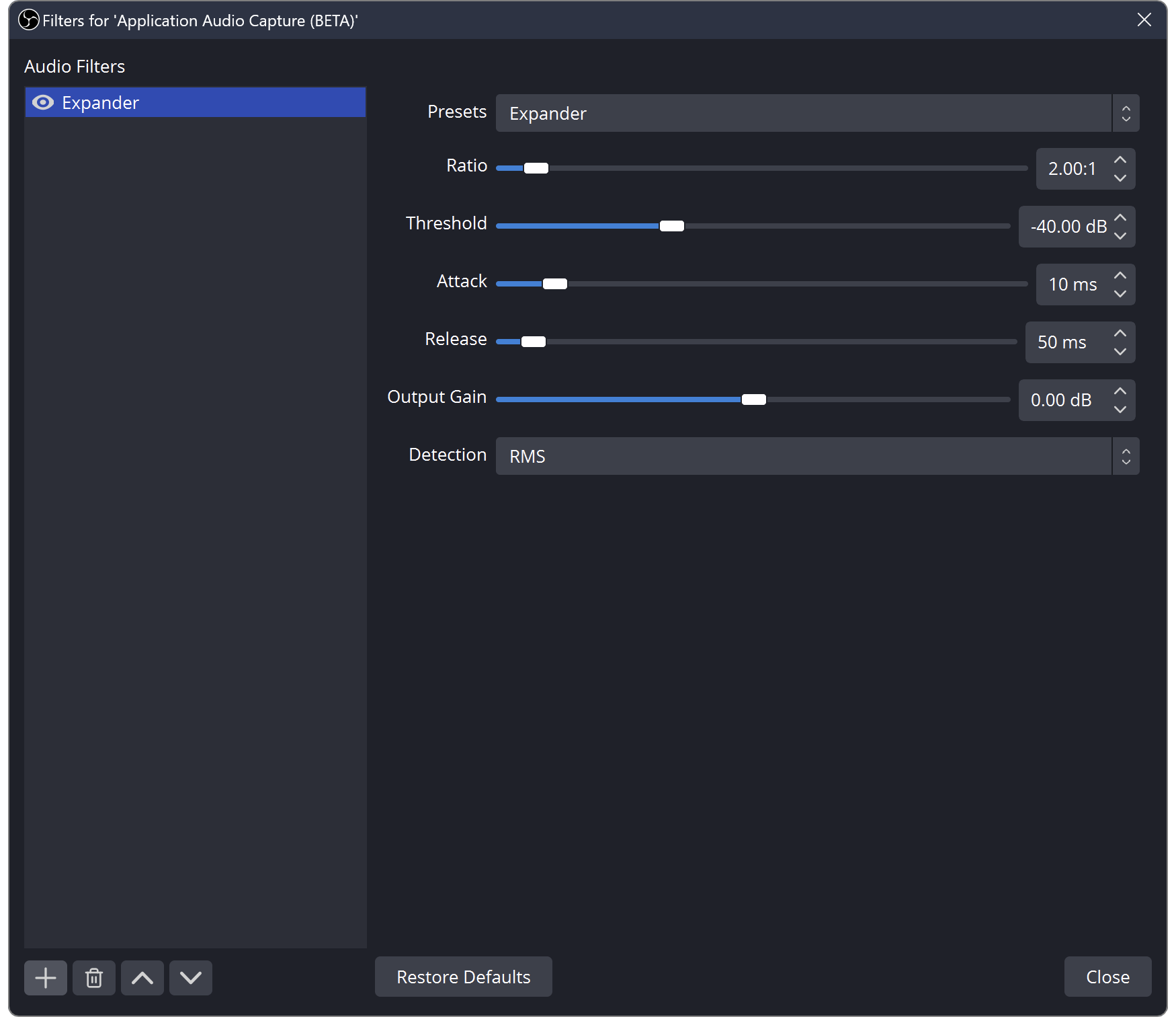 | Output Gain | Increases the output level of the expander by applying gain, generally not needed but can be used to increase your microphone level before outputting it | 0.00 dB |