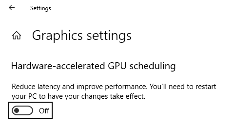 From there, set "Hardware-accelerated GPU scheduling" to OFF, then reboot your computer.