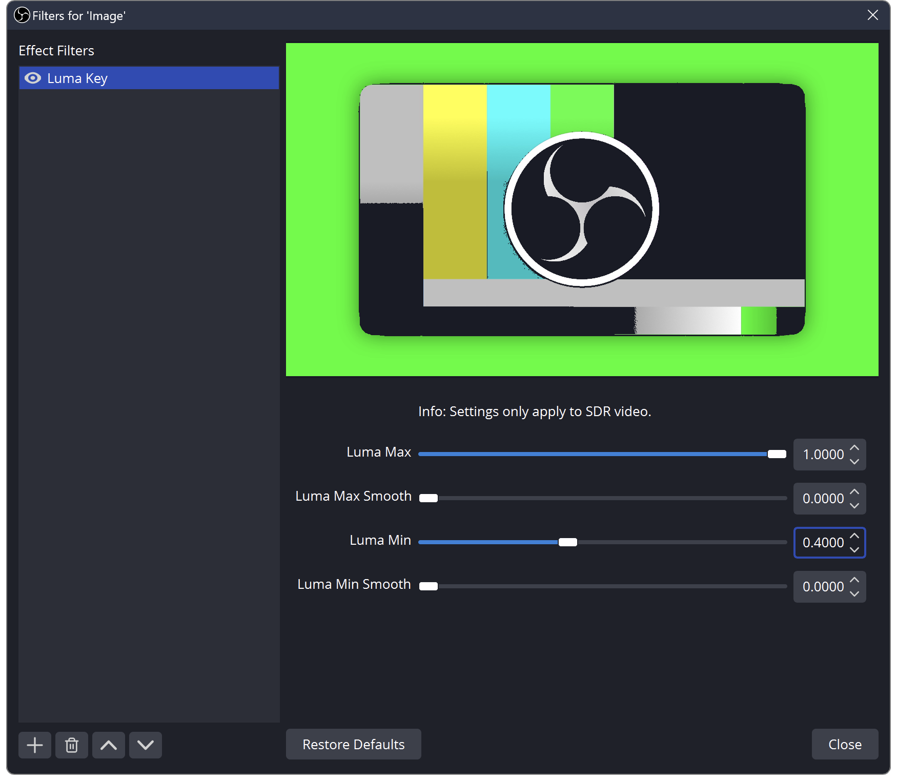 Similar to the Chroma Key Filter, modifies the opacity of pixels in the image. Unlike Chroma Key, Luma Key works based on lightness. This is an easy way to key out white or black, leaving transparent pixels in the Source.