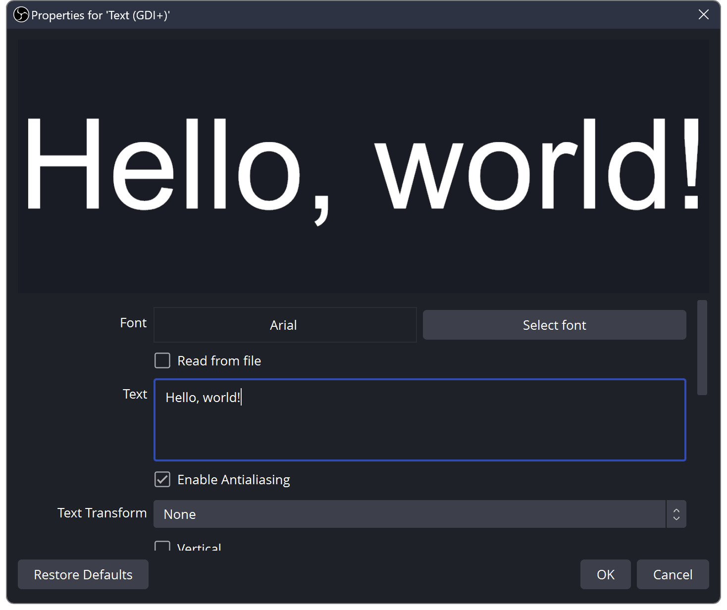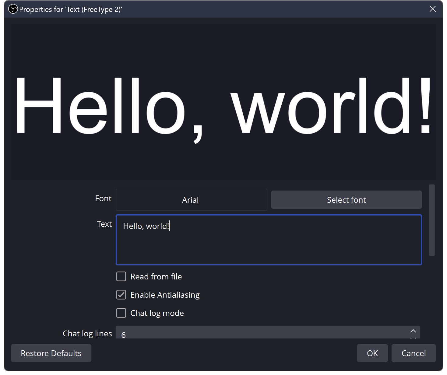 Text sources allow you to add simple text renders to your stream or recording layout. To get going, most of the default settings will be fine (except maybe the colors), and you can just type what you want your text to say in the field labeled "Text."